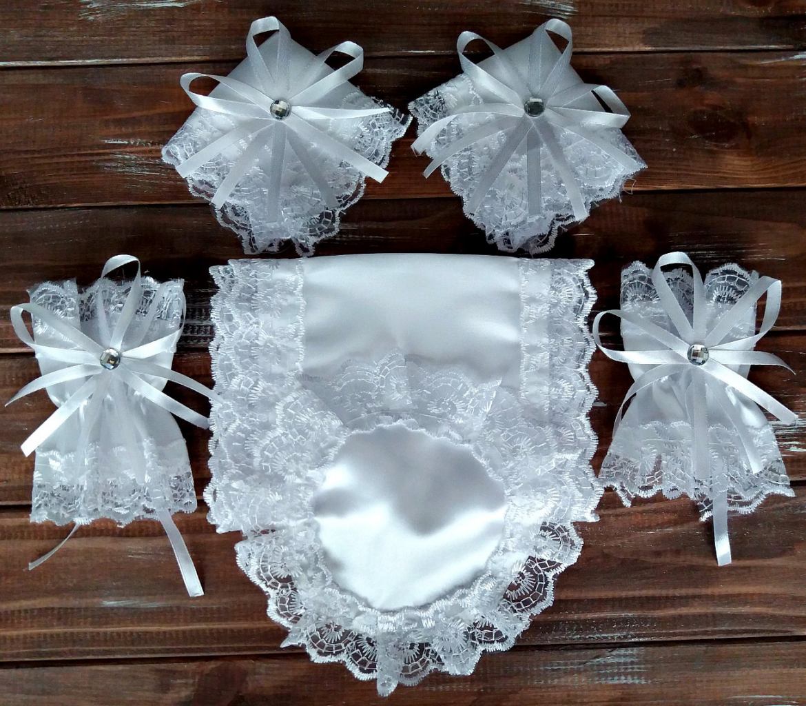 Артикул: 285534 Найменування: Вінчальний набір ХТ-ВН1 білий Опис: Набір пошитий з атласу та мережива. Декорований камінцями та бантиками. У комплект входить: рушник для перев'язування рук (112*19 см), кругла серветка для піднесення кілець (дмаметр 17 см), два платочка для утримання вінця (19*18 см) і дві серветки на зав'язках для свічків (23*11 см). Одиниці виміру: набір Залишок на складі: 0.000 Ціна: 360.00 грн.