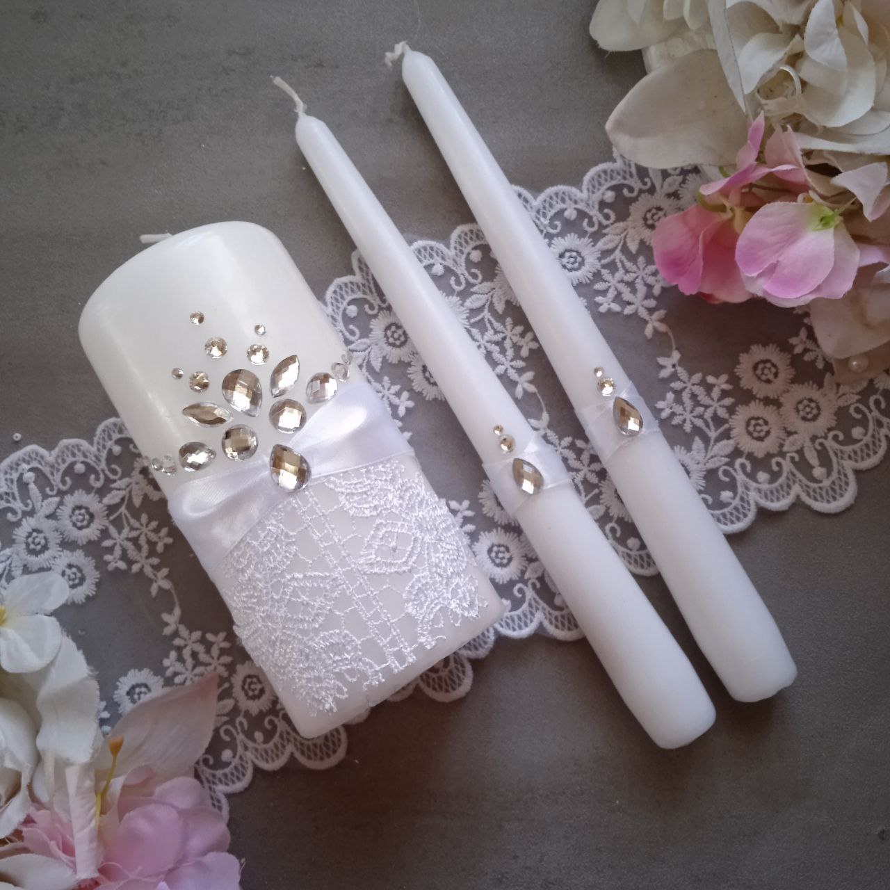 Весільні свічки "Сімейне вогнище". Декоровані атласними стрічками, мереживом та стразами. Ручна робота.